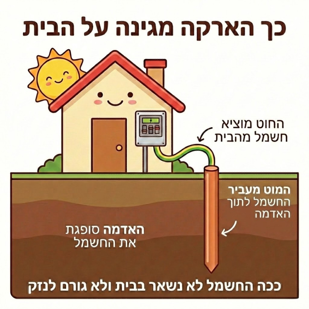 החוט מחבר בין מערכת החשמל בבית לבין מוט תקוע באדמה, וכך החשמל זורם החוצה במקום להישאר בפנים.